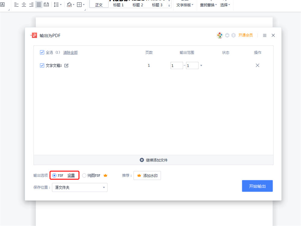 WPS中,还可以选择“输出为PDF”将文件另存为“PDF文件”。但使用此方式时,请在输出选项中选择“PDF”。切记不可选择“纯图PDF”,不然将严重影像打印质量!