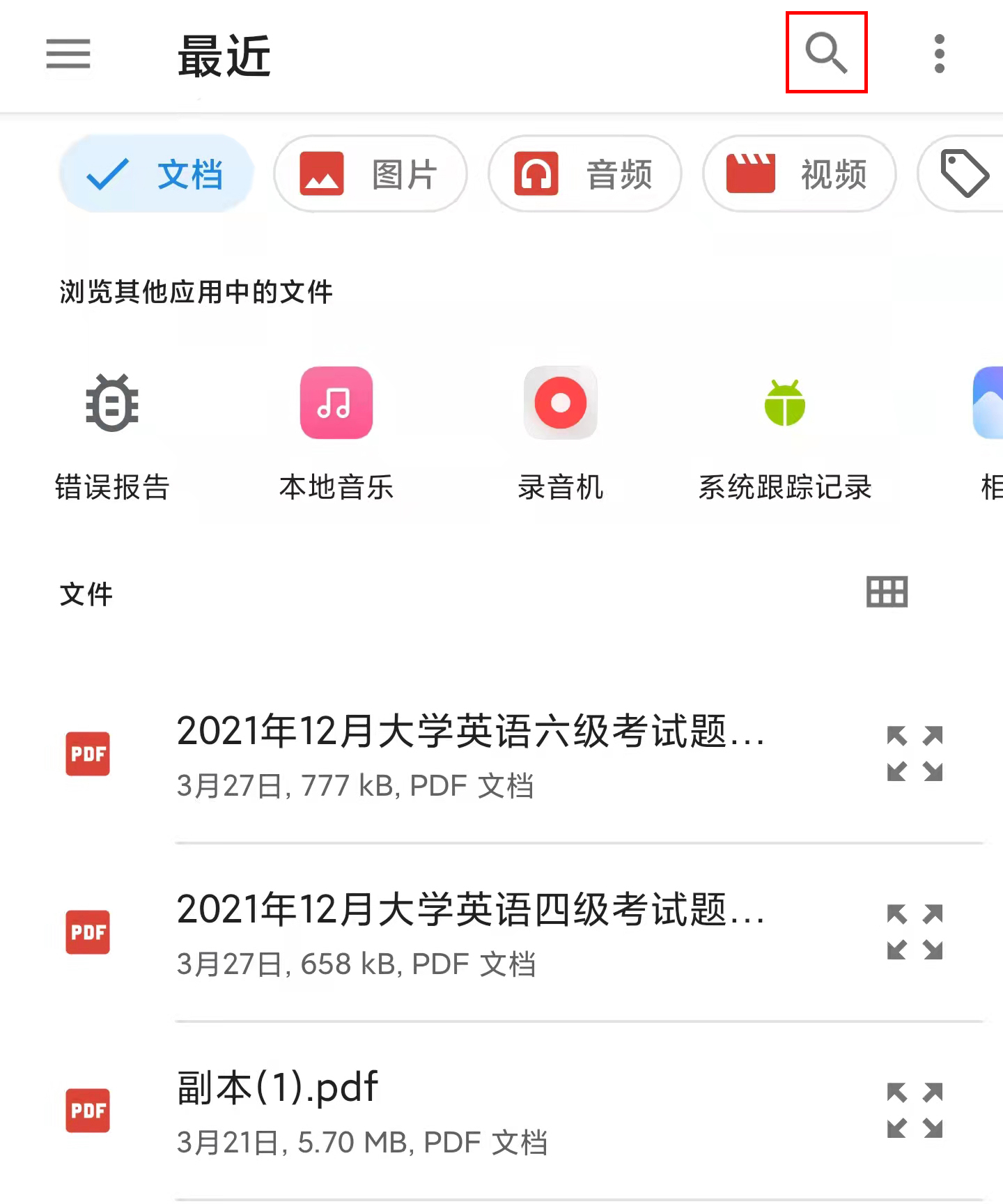 提示:可以使用“手机文件管理”的搜索功能(上图红框),快速找到需要的文档